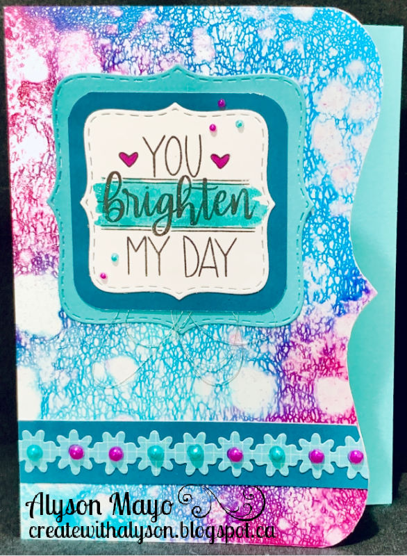 Painting is not my thing... I used two shimmer brushes, mixed the colours with water and painted across the front panel in two colours. The bird was stamped, coloured and die cut and I added a sentiment underneath. Inside the card, there is a second sentiment and a place for a message. I added some clear gems on the front as well.