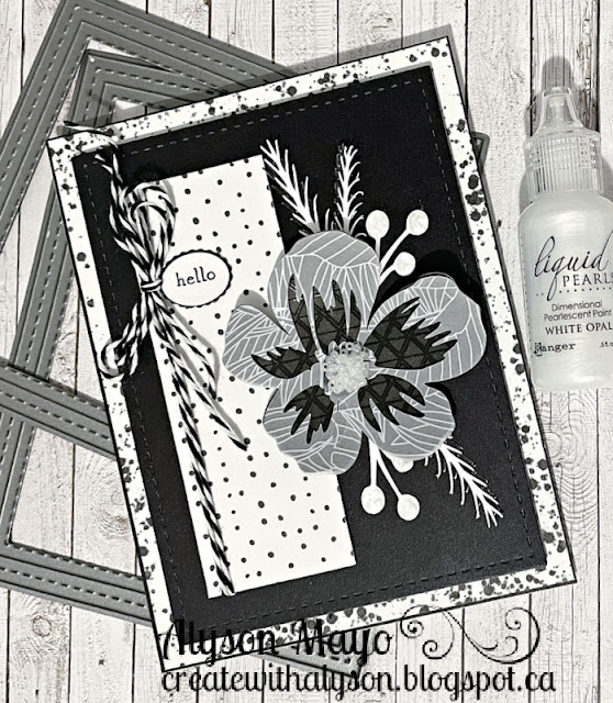 I started with some black and white patterned papers and decided I wanted to use dot patterns. I also went to my Cricut and cut a flower and leaves from the Serenity collection. The front of the flower was cut from patterned vellum and I added little white beads in the center. A piece of black and white twine was tied around one piece of patterned paper and I added a tiny sentiment just where the bow is tied. I added some White Opal Liquid Pearls to the centres of the berries and brushed the branches with the Clear Shimmer Brush. I am pretty happy with the end result... working with only two colours isn't always easy!