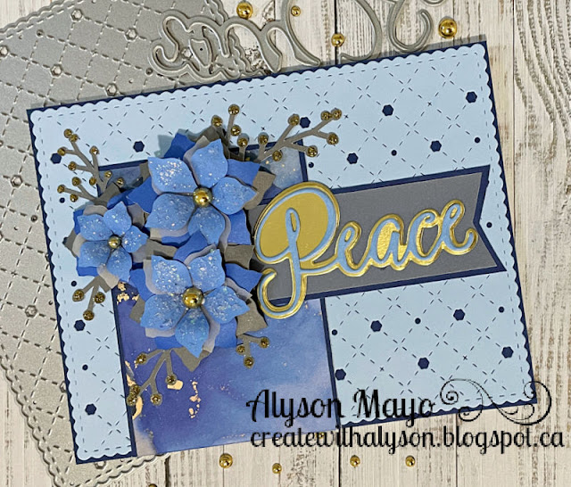 The background was die cut using a stitched lattice die and adhered to a piece of dark blue cardstock. I cut the flowers and branches on my Cricut and added a vellum layer on each flower. They also had some glass shimmer added to the front layer. The sentiment was also die cut and placed on a piece of vellum. Once all the flowers and branches were in place, I added gold gems to the centres of the flower and gold Stickles to the berries on the stems.