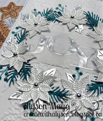 I used some shimmery cardstock for the flowers and silver foil paper for the leaves so that's the shimmer (twinkle) component. The wreath elements were all die cut and arranged around a silver embossed sentiment on vellum. I embossed the white background with a holly embossing folder and adhered it to a turquoise border and then to the white card base. A silver gem was placed in the centre of each poinsettia and I added Liquid Pearls to the berry branches.