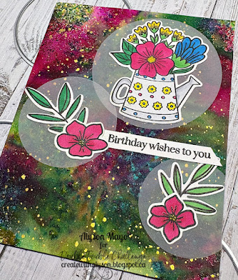 The background was created by using Lindy's Magical Powders. They are shimmery on their own but I also splattered gold paint on the finished design. The images were stamped, coloured and die cut. They were somewhat lost on the background so I placed each of them on a vellum circle as per the sketch. The sentiment was added just under one of the flowers. I used a clear shimmer brush on parts of the images.
